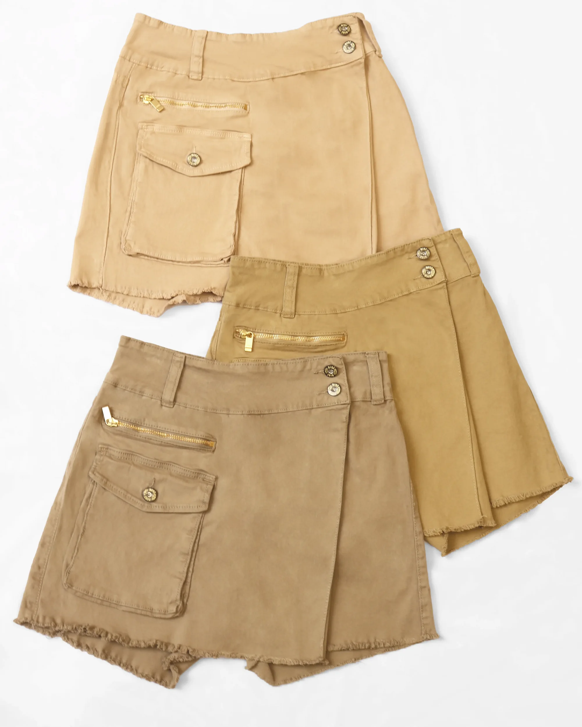 Falda short en tela drill con elasticidad, con bolsillo cargo, Su silueta ajustada. Disponible en tres tonos versátiles para complementar cualquier outfit.
