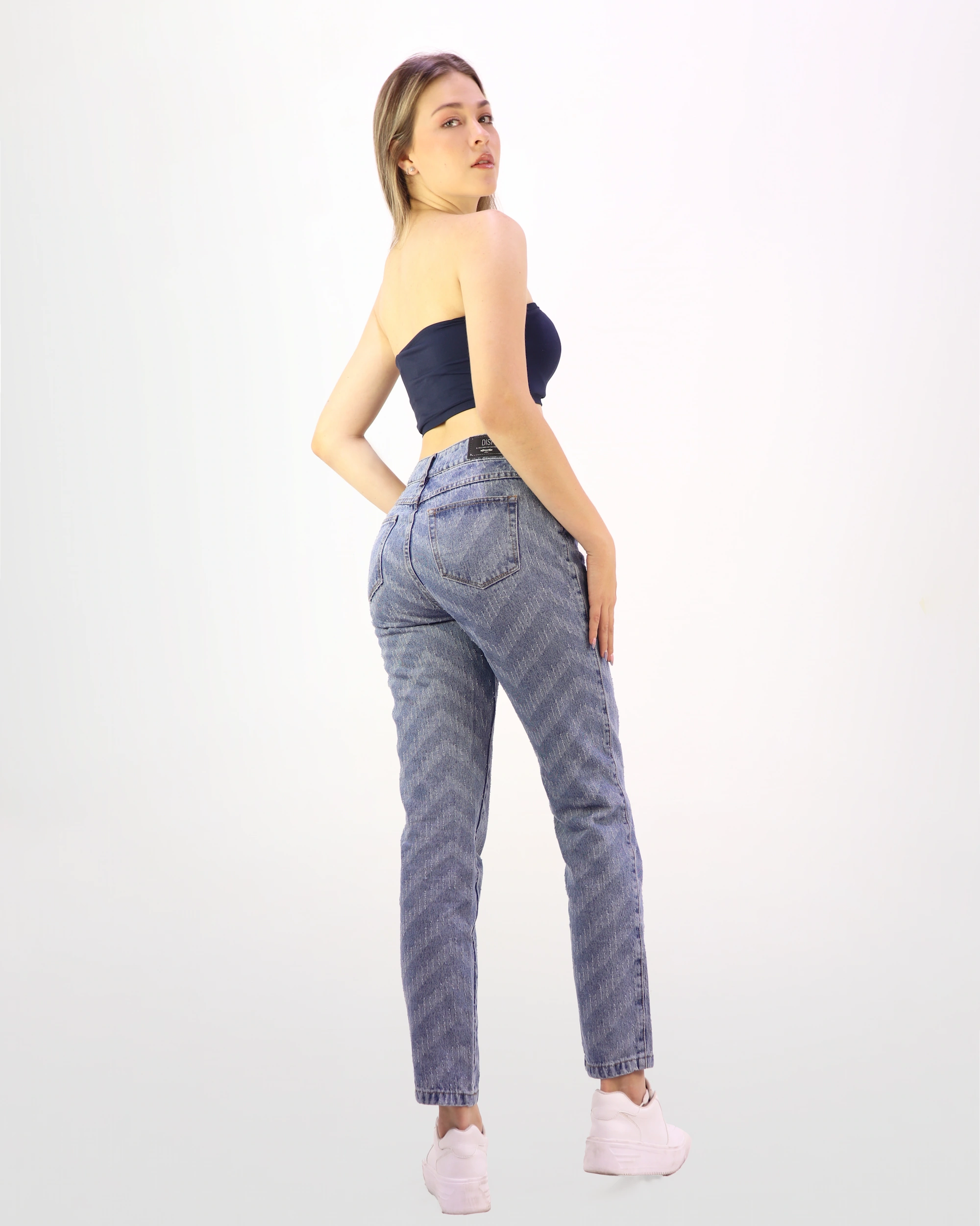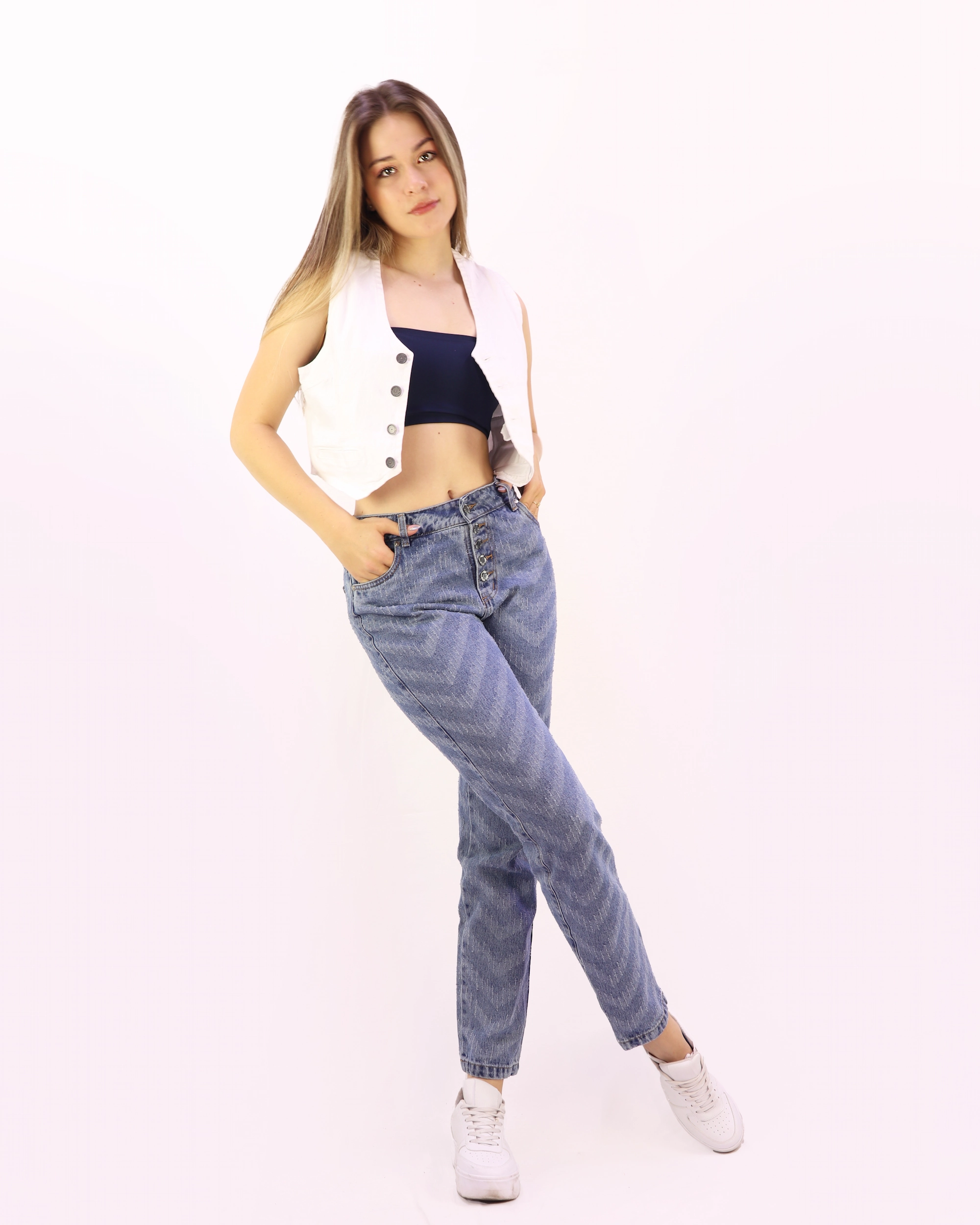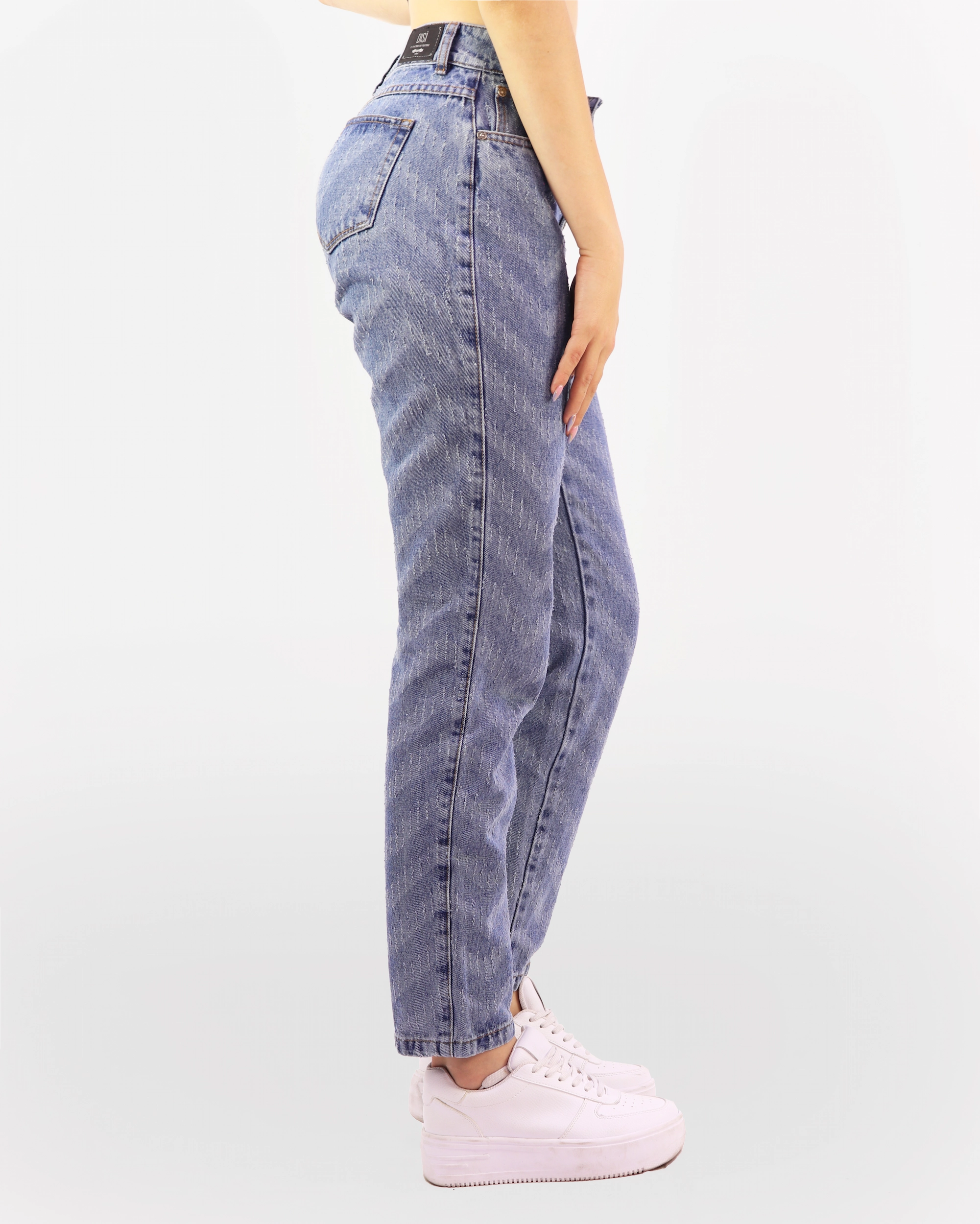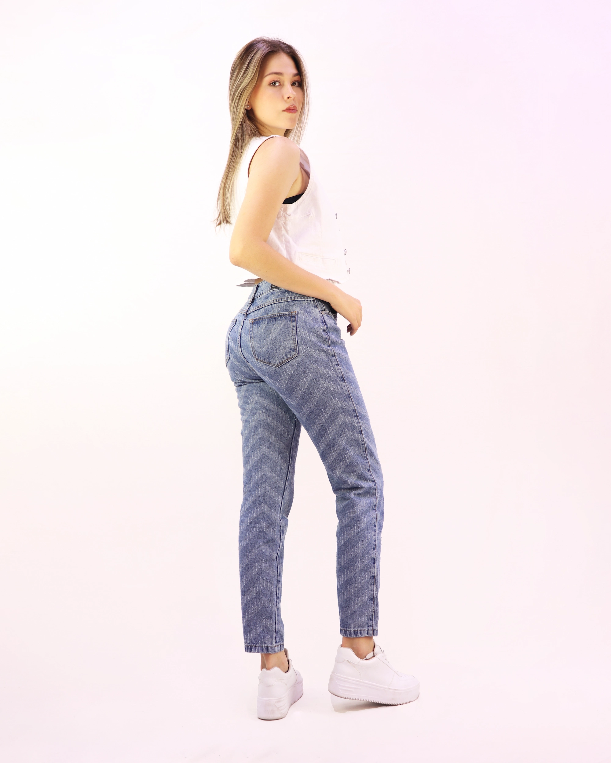Jean Mom Fit de tiro alto con cinco botones y diseño láser en patrón que añade un toque moderno y único. Silueta semi-ajustada con largo normal, perfecto para un estilo casual y versátil. Disponible en color azul medio, confeccionado en material de alta calidad para garantizar resistencia y durabilidad.