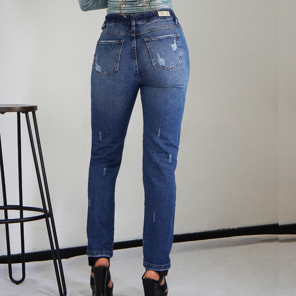 Jean mom fit de pierna ajustada con diseño único de rotos en la parte delantera y parches internos para un estilo moderno y audaz. Sin elasticidad, con cierre de cremallera y botón para un ajuste clásico. Confeccionado en 100% algodón, ideal para looks casuales.