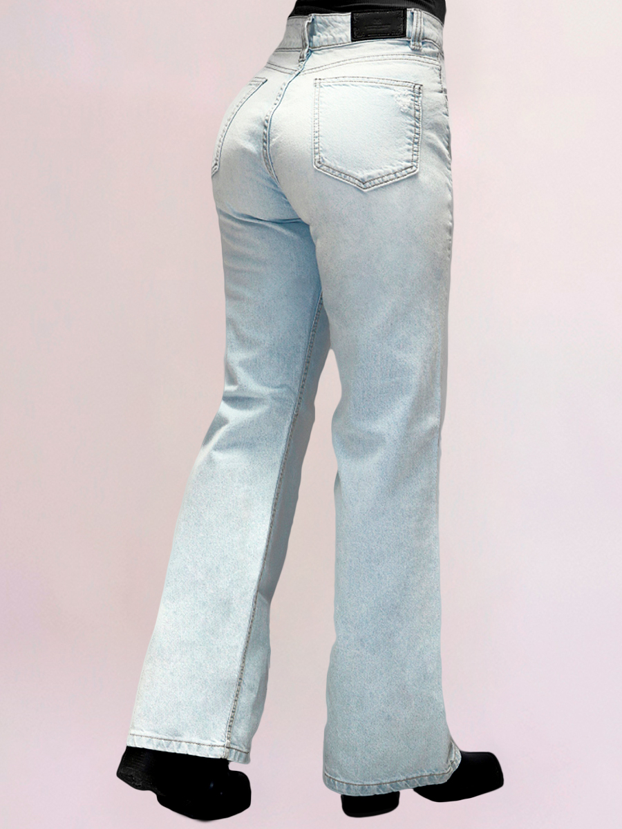 Jean tiro alto sin elasticidad, super levanta cola, Bolsillo cuadrado frontal, Pierna recta, cremallera y boton. Composicion 100% algodon, Denim liviano
